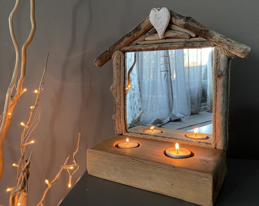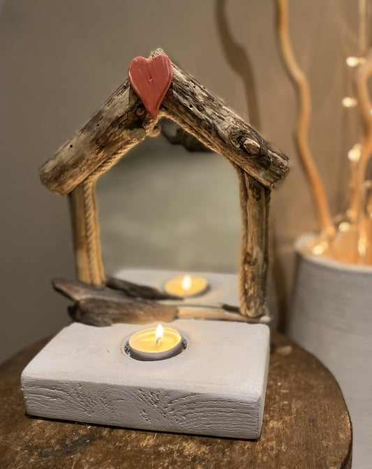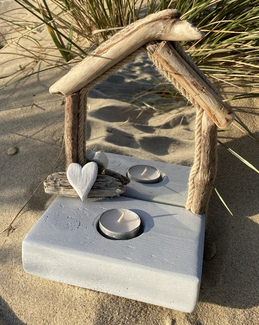 Driftwood Beach House Mirror with Tea light holders and Heart