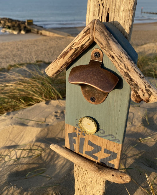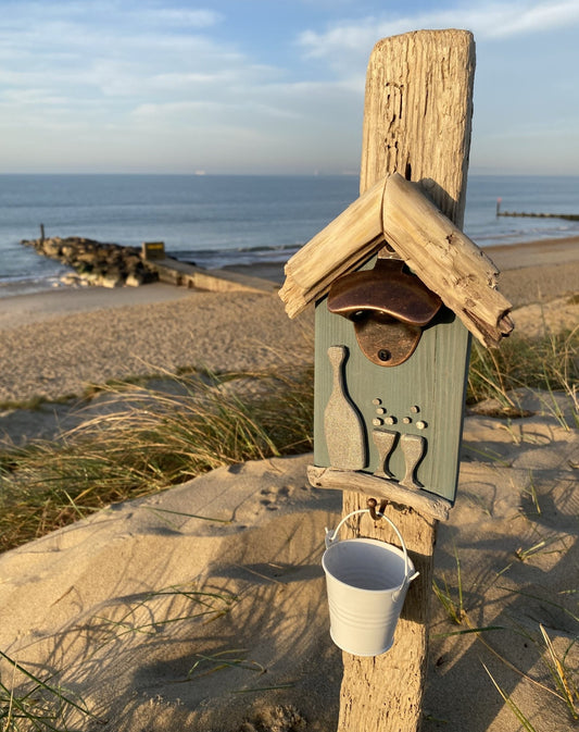 Driftwood beach hut bottle opener with Prosecco and white bucket