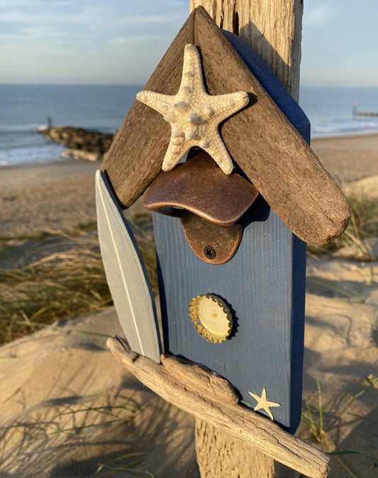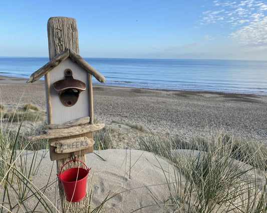 Driftwood Beach Hut Bottle Opener with Red Bucket