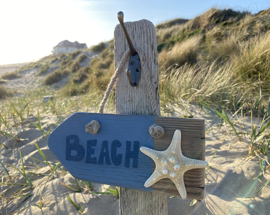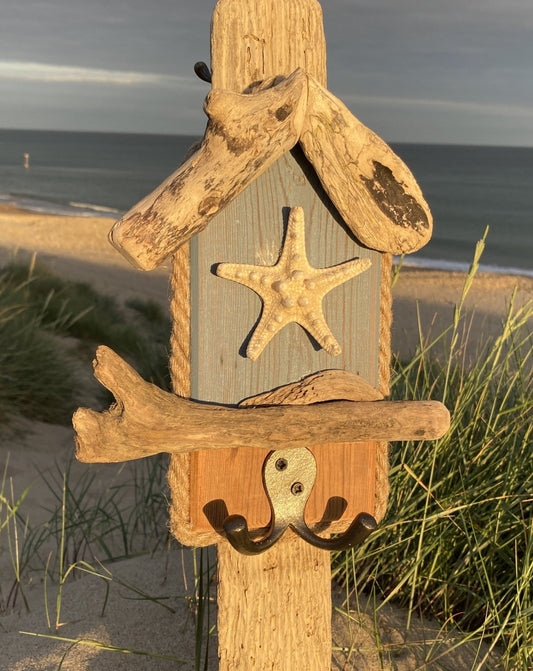 Driftwood Beach Hut Hook with Starfish & Heart - Light Blue