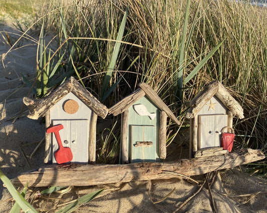 Driftwood beach huts - triple grey green grey - red bucket and spade