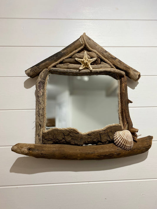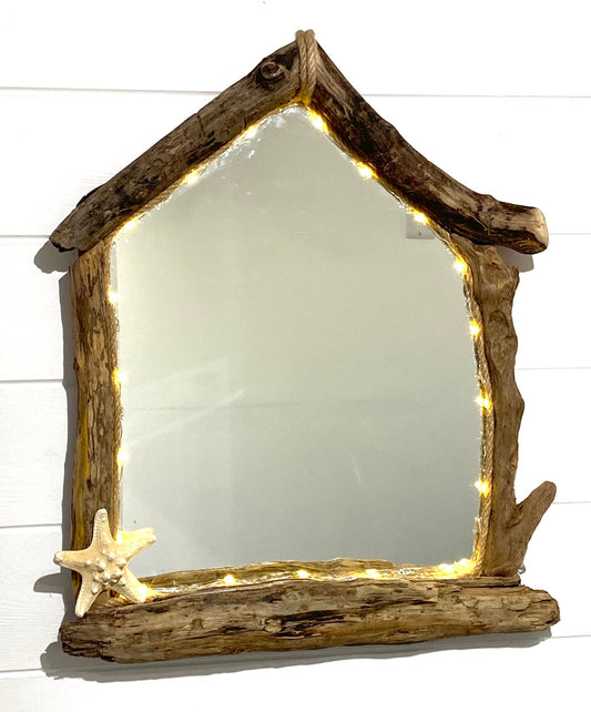 Driftwood Beach House Illuminating Mirror with Starfish and Shell