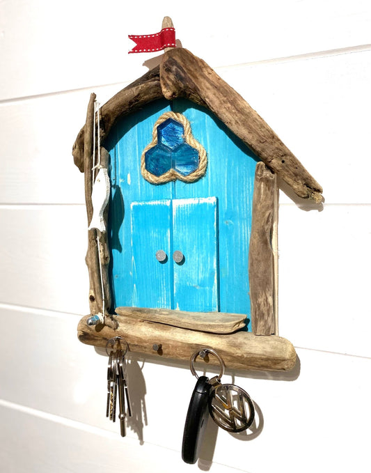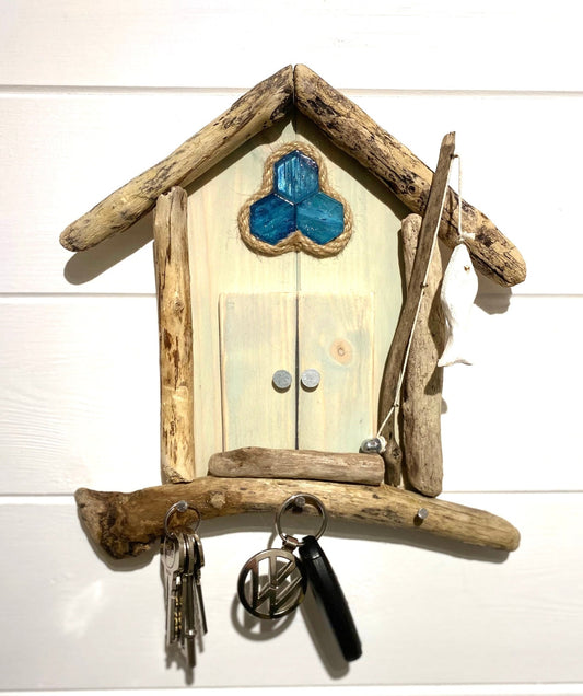 Driftwood Beach Hut with Key Hooks & Fishing Rod - Turquoise